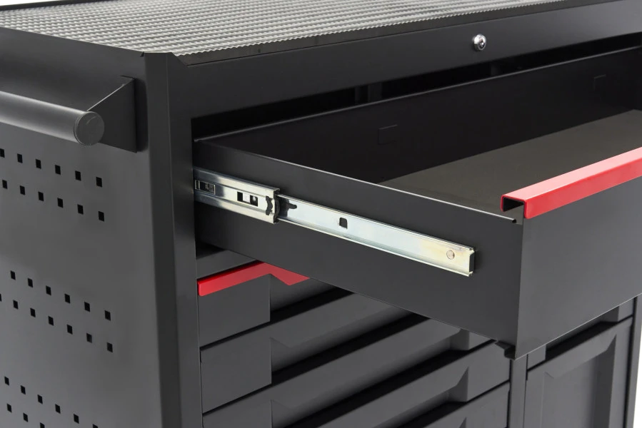 Met een ovale metalen zijhandgreep en 5 inch zwenkwielen (waarvan 2 met remmen), is deze wagen gemakkelijk te verplaatsen en te positioneren waar je maar wilt. Daarnaast is er een handig roestvrijstalen werkblad bovenop, ideaal voor het uitvoeren van projecten of het tijdelijk neerleggen van gereedschap. Elke lade is bekleed met 2.5mm PE-voeringen om je gereedschap te beschermen en de lades soepel te laten schuiven.