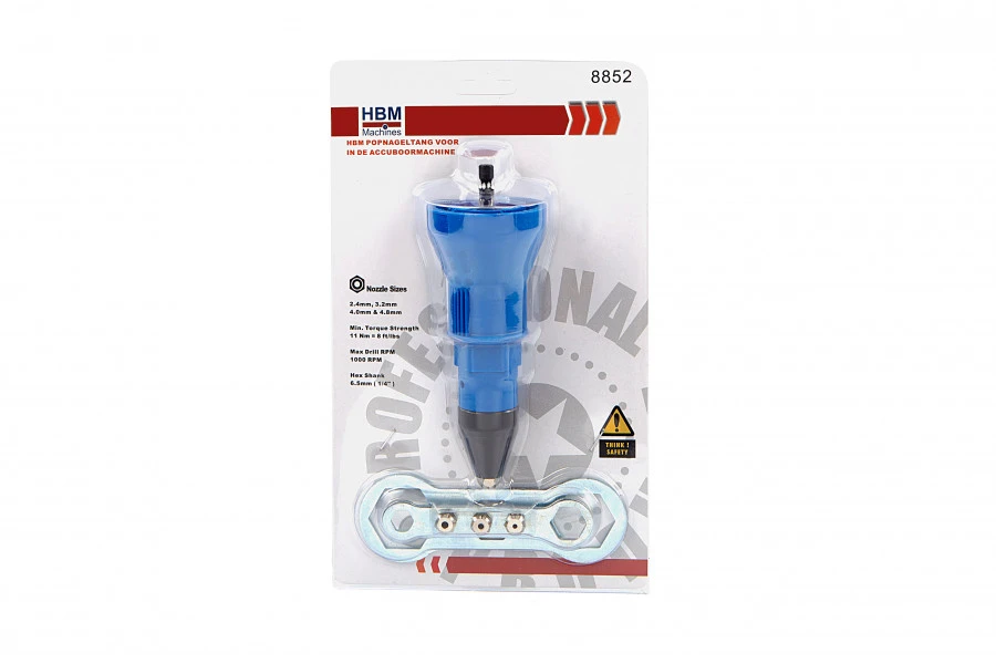 Beschik je over een professionele boormachine, maar moet je ook regelmatig popnagels aanbrengen? Dan is dit opzetstuk perfect. Het hulpstuk verandert de uitgang van je boormachine in een popnageltang. Dit verlengstuk is een must-have voor professionals die vaak van werkwijze veranderen, en dat snel moeten kunnen doen.