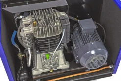 De robuuste Michelin MCX 958 N luchtcompressor is een hele stille compressor, Het geluidsniveau van 66 decibel (op vier meter afstand) komt ongeveer overeen met dat van een gemiddeld kantoor. De 7,5 pk sterke elektromotor zorgt voor de riemaandrijving van deze tweetrapscompressor. De twee cilinders persen de lucht samen tot een werkdruk van 10 Bar. De vier stelvoeten maken dat de compressor ook op een licht oneven ondergrond geplaatst kan worden. Aan de voorzijde bevindt zich de aan/uit-knop en de manometer.
