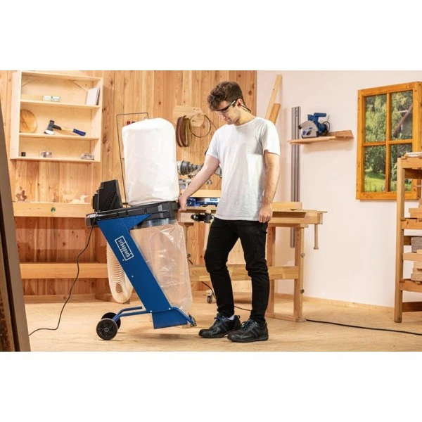 De Scheppach Spaanafzuiging DC500, een opmerkelijke opvolger van de eerdere Scheppach HD12, onthult een geavanceerd afzuigsysteem dat zich moeiteloos aanpast aan diverse machines. Met een afzuigvermogen van 1150 m³/h, komt dit systeem volledig tot zijn recht bij het verwijderen van omvangrijke hoeveelheden spanen. Dit alles wordt naadloos opgevangen in een royale opvangzak met een capaciteit van 75 liter, wat resulteert in een praktisch stofvrije werkruimte tijdens diverse bewerkingsactiviteiten, zoals zagen, slijpen, schuren en schaven.