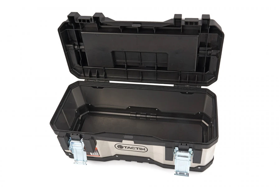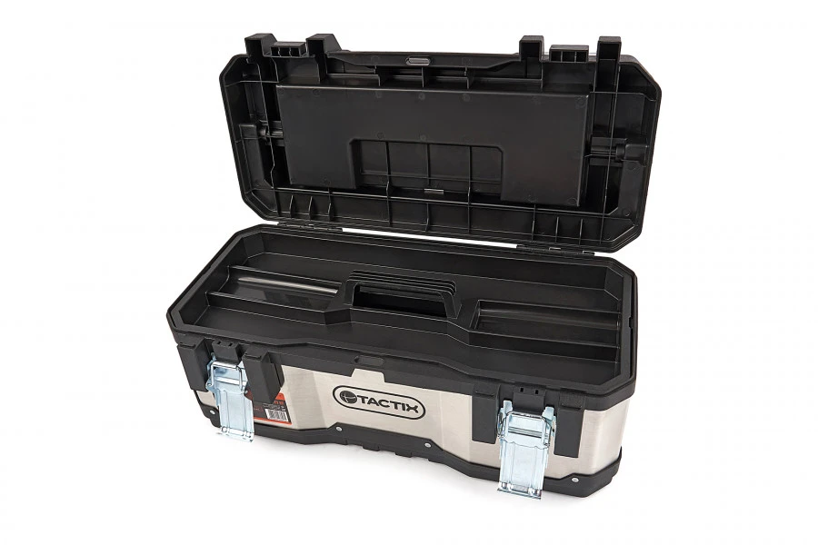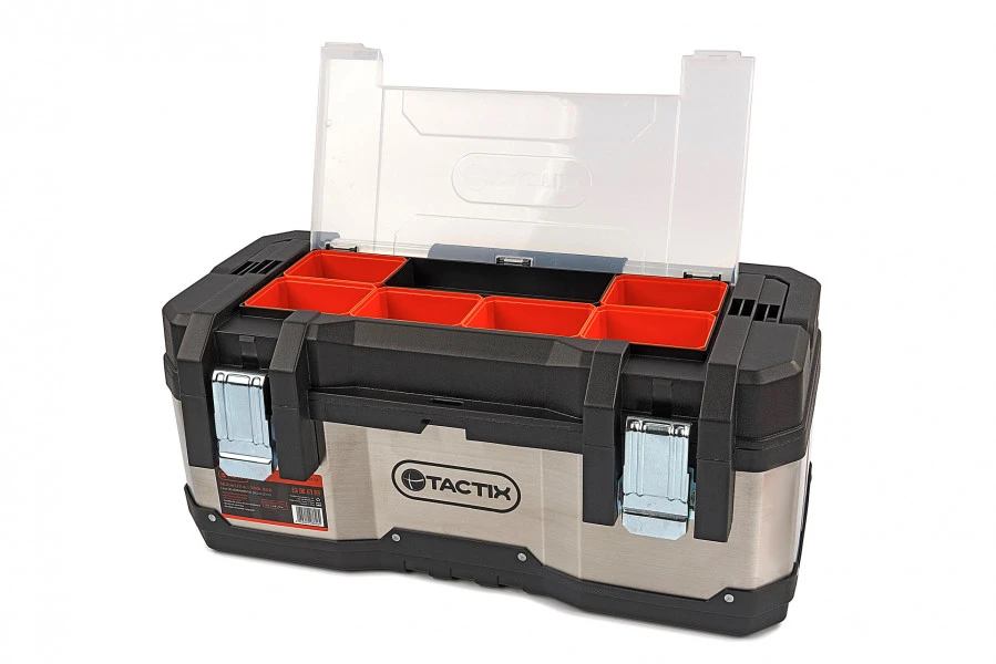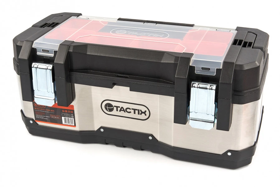 Over de Tactix Professionele RVS Gereedschapskoffer Met Uitneembare Opbergbakjes